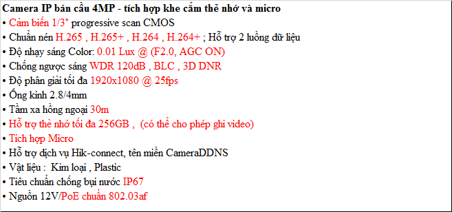 Thông số kỹ thuật :Camera IP bán cầu 4MP - tích hợp khe cắm thẻ nhớ và micro• Cảm biến 1/3" progressive scan CMOS• Chuẩn nén H.265 , H.265+ , H.264 , H.264+ ; Hỗ trợ 2 luồng dữ liệu • Độ nhạy sá...
